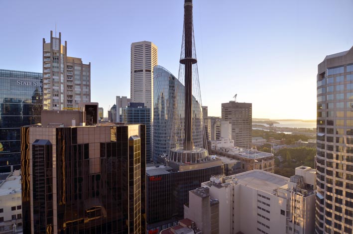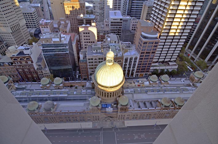 … nach rund 30 Stunden geht die Sonne auf. Wie viel Bordkino verträgt der Mensch? Ich hab mir insgesamt 4 Filme auf diesem Flug genehmigt. Immerhin alle aus der Kategorie oskarprämiert. Einer war saugut, bei den andren drei hätte ich zuhause ausgeschalten. Aber – man sollte auch an den Rückflug denken und da besteht ja nochmal eine Chance. Umso stärker war die Ankunft in Sidney. Fast Vollmond über dem Hafen um 5 Uhr mrogens und aus dem Hotel im 32. Stock eine erste Impression von australischer Sonne und Sidney. Und etwas Nostalgie mit dem Blick auf die Kuppel.