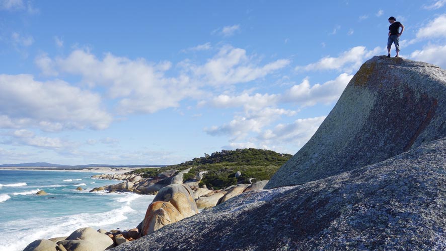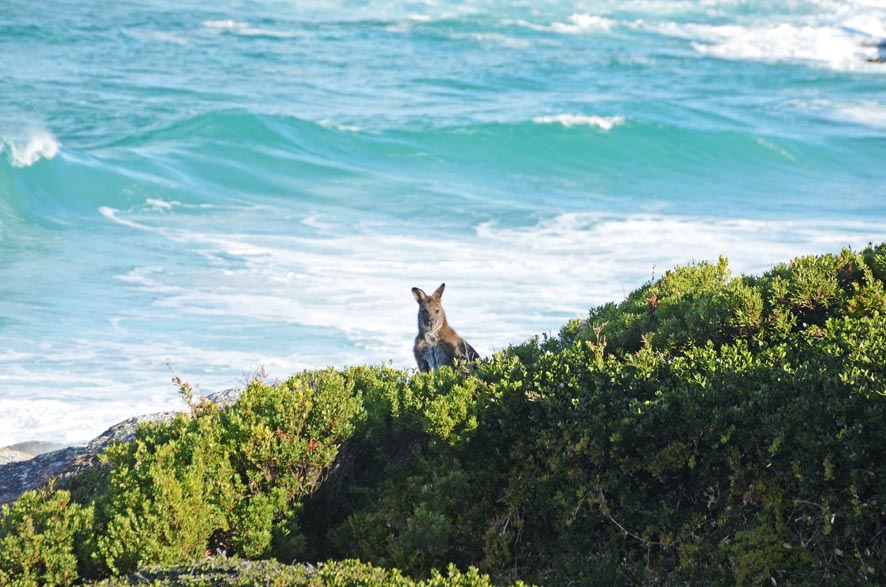 ..zufällig ein Wal an diesem Wahnsinnsstrand vorbeischwimmen sollte, würde ich sofort unter Protest „wegen übermäßger Ungleicheit an landschaftlichen Schönheiten“ das Land verlassen. „too much“ – anders kann man es wohl kaum beschreiben, was hier in Tasmanien so geboten wird. Heute geht es entlang der Bay of Fires zur gleichnamigen Lodge und außer entlang am Strand und etwas auf und ab in den Dünen und unendlich lange Blicke über einen astreinen, weißen Strand ist nicht viel mehr zu tun als zu Staunen. Als ob das nicht genügen würde. Trotzdem, nach der Ankunft in der Superlodge, erlaube ich mir nochmal einen Spaziergang durch die Dünen und treffe auf diesen mehr als friedlich gesinnten Beobachter…